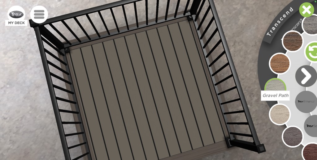 Den nya Trex-appen ger användarna en panoramavy för att experimentera med varumärkets omfattande utbud av däck och utvalda räcke. Det interaktiva och mycket intuitiva programmet innehåller också användbara planeringsverktyg som hjälper till att fastställa storlek/kvadratiska bilder och uppskatta materialbehov. Den genererar till och med en materiallista med knappar på skärmen för att ta användare direkt till Shop Trex webbplats där de kan beställa produktprover. Konsumenter kan också skicka sina val via e-post till sig själva, vilket gör det enkelt att prata med entreprenörer när det är dags att bygga. Husägare kan också beställa produktprover, hitta lokala Trex-återförsäljare och forskningsbyggare inom sitt område, allt inom applikationen.